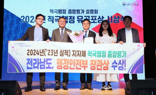 전라남도는 행정안전부에서 243개 전국 지자체를 대상으로 2023년 적극행정 실적을 평가한 결과, 우수기관에 선정돼 행정안전부 장관상을 수상했다고 밝혔다.