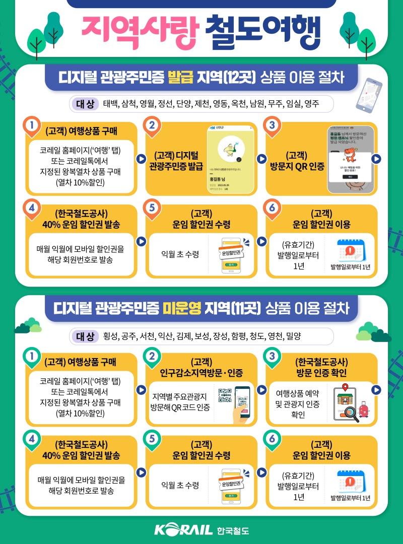 이번 협약을 계기로 디지털 관광주민증을 운영하는 12개 지역의 인근 철도역을 이용하는 왕복열차 승차권 운임의 10%를 우선 할인한다.