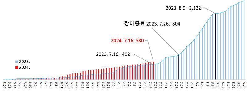 이 해의 온열질환자 누적 현황을 일자별로 분석해 보면 장마가 종료된 7월 26일 이후로 가파르게 증가한 바, 올해도 장마가 그치고 난 후에는 폭염으로부터 건강지키기에 더욱 신경써야 한다.