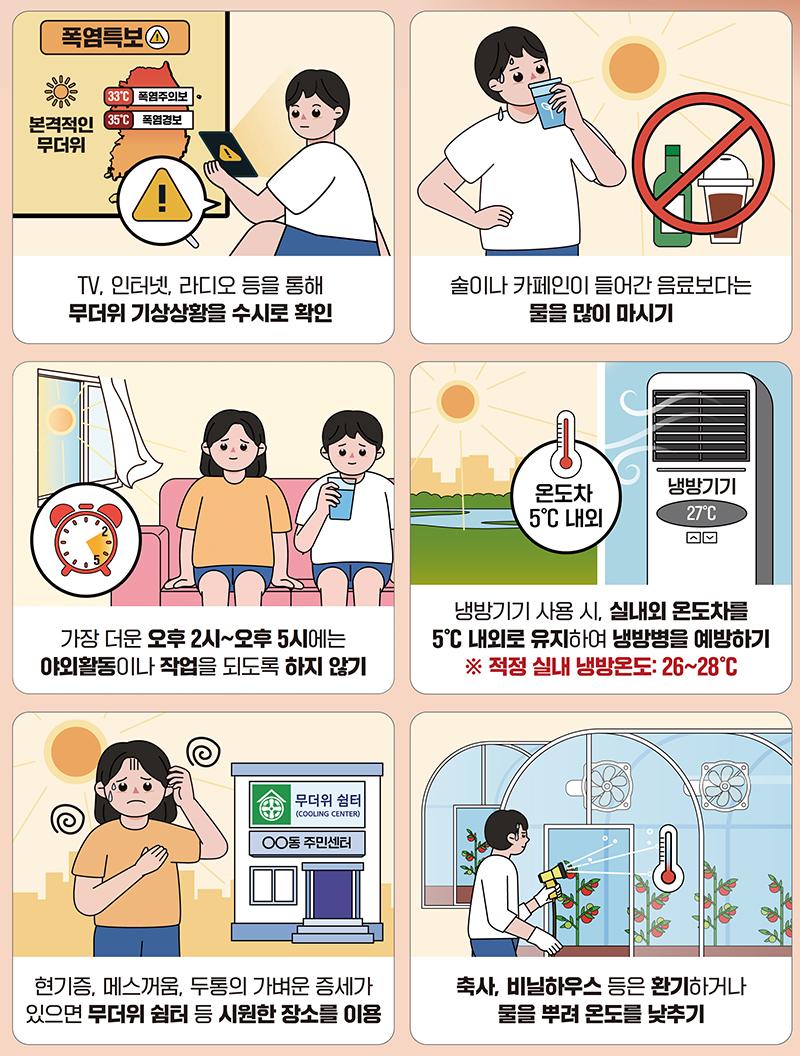 특히 “땡볕이 내리쬘 때 야외 작업은 물론, 논·밭과 비닐하우스에서의 농사일은 매우 위험하니 가급적 자제하는 등 국민행동요령을 지켜 건강한 여름 보내시길 바란다”고 당부했다.