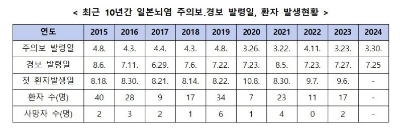 일본뇌염 매개모기 감시체계 운영 결과, 지난 24일(30주차) 경남과 전남에서 일본뇌염 매개모기인 작은빨간집모기가 각각 전체모기의 63.2%(2456마리), 58.4%(1684마리)로 확인돼 올해 일본뇌염 경보발령일은 지난해와 동일한 주차에서 발령했다.