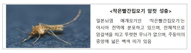일본뇌염을 매개하는 작은빨간집모기는 논이나 동물축사, 웅덩이 등에 서식하는 암갈색의 소형모기로 우리나라 전역에서 발생해 주로 야간에 흡혈 활동을 하고 8~9월에 매개모기 밀도가 정점에 이르며 10월 말까지 활동하는 것으로 관찰된다.