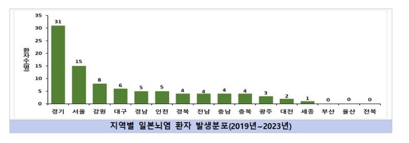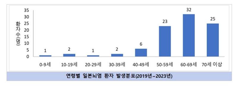 국내 일본뇌염 환자는 해마다 20명 안팎으로 발생하며, 대부분 8~9월에 첫 환자가 신고되고 11월까지 발생하며, 최근 5년(2019년~2023년) 동안 일본뇌염으로 신고된 환자 91명의 특성을 살펴보면, 50대 이상이 전체 환자의 87.9%(80명)를 차지했고, 지역별로는 경기, 서울, 강원 순으로 많이 발생했다.