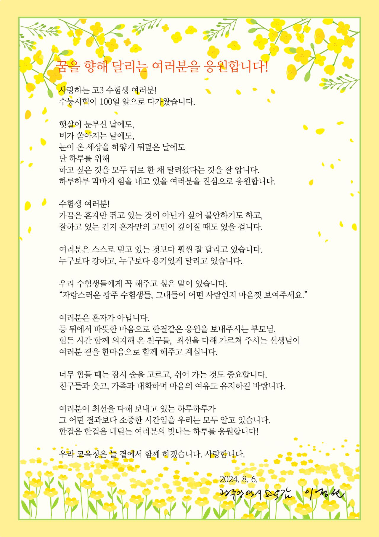 이 교육감은 서한문에서 “자랑스러운 광주 수험생들, 그대들이 어떤 사람인지 마음껏 보여주라”며 “여러분들 곁에는 부모님, 친구들, 선생님들, 광주교육가족 모두가 한마음으로 함께하고 있으니 수능시험이 끝나는 순간까지 최선을 다해 주기 바란다”고 밝혔다.