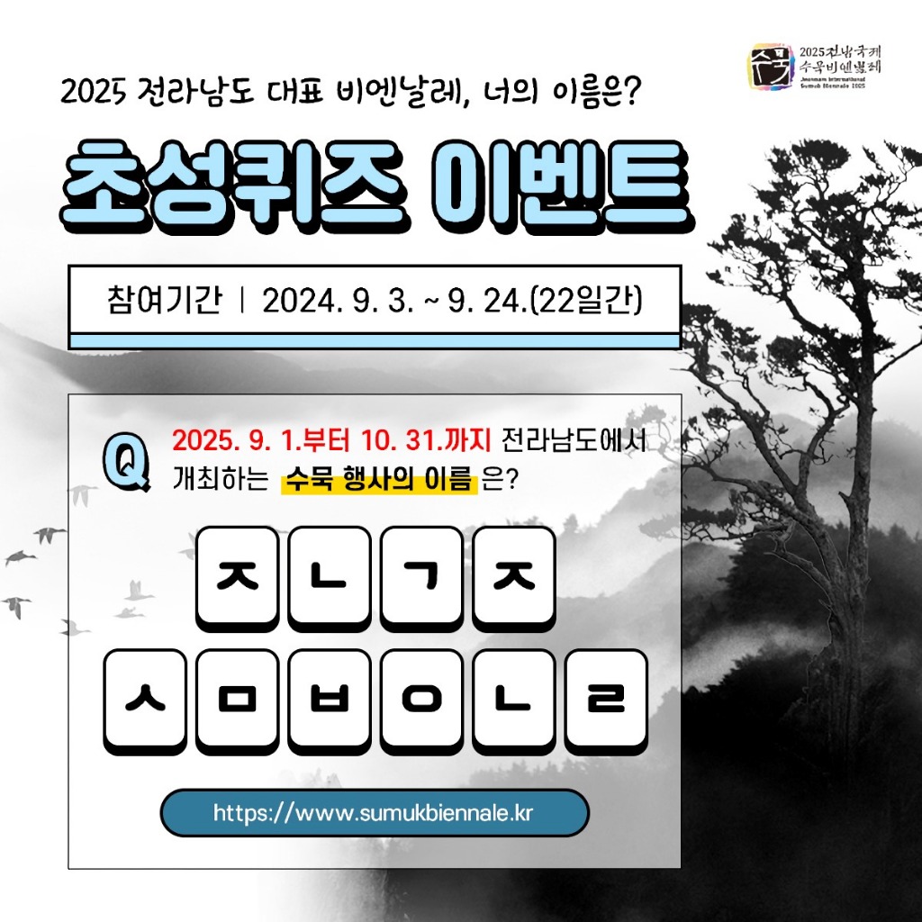 매달 다양한 주제와 내용으로 기획되며, 참여 방법은 전남국제수묵비엔날레 공식 누리소통망에 공지하고, 선착순 또는 추첨을 통해 수묵만의 특별 기념품 등을 증정할 예정이다. 9월 이벤트는 초성퀴즈로 선착순으로 당첨자를 결정한다.
