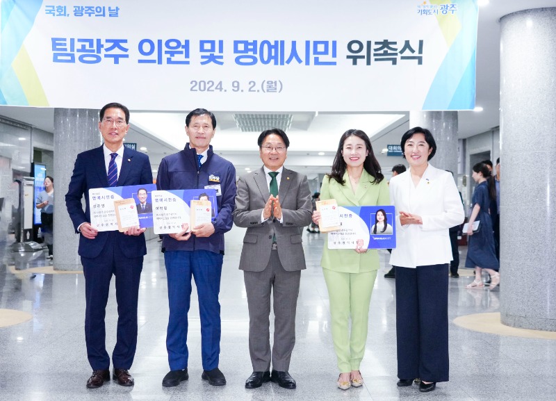 광주광역시(시장 강기정)는 ‘국회, 광주의 날’ 첫째날인 2일 서울 국회에서 ‘팀광주 국회의원 및 명예시민 위촉식’을 열어 위촉패와 광주명예시민증을 전달했다.