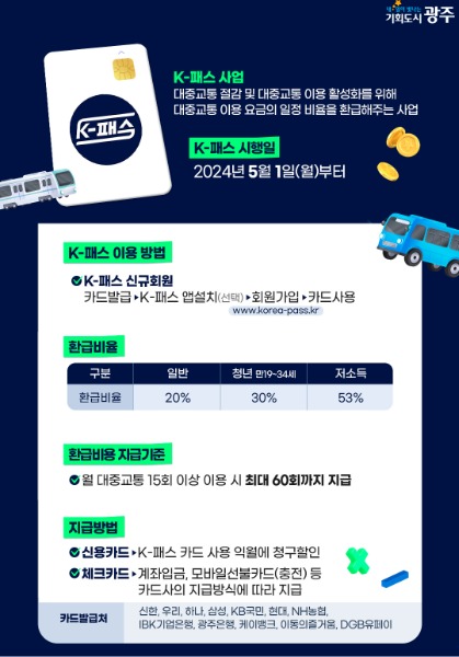 K-패스를 발급‧등록한 광주시민은 올해는 정부의 K-패스 지원율에 따른 혜택을 받고, 내년부터 광주G-패스가 시행되면 별도의 절차 없이 자동으로 광주시가 지원하는 추가 혜택을 받는다.