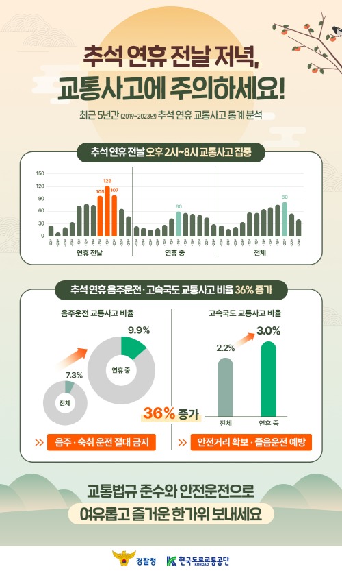 한국도로교통공단은 최근 5년간(2019~2023년) 추석연휴 교통사고 빅데이터를 분석한 결과, 연휴 전날의 교통사고가 가장 많은 것으로 나타났다고 밝히며, 9월 13일(금) 귀성길 안전운전을 당부했다.