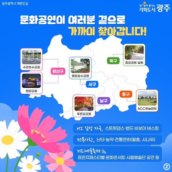 광주광역시(시장 강기정)는 시민들이 일상에서 공연을 즐길 수 있는 찾아가는 문화공연 ‘예술愛(애) 물든 가을’ 프로그램을 운영한다.