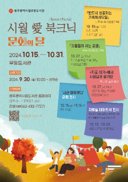 광주광역시시립도서관(무등·사직·산수)은 10월 문화의 달을 맞아 가족들이 함께 즐길 수 있는 강연·전시·체험행사 등 ‘시월 애(愛) 북크닉’ 행사를 운영한다.
