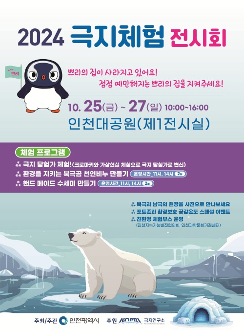 인천광역시는 오는 10월 25일(금)부터 27일(일)까지 인천대공원 전시실에서 ‘2024년 극지 체험 및 전시회’를 개최한다고 밝혔다.