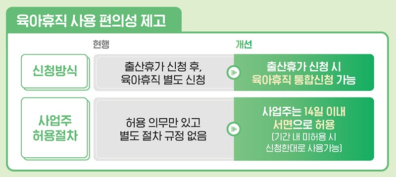 때문에 근로자 신청 후 14일 이내에 사업주가 서면으로 허용의 의사표시를 하도록 하고, 사업주 의사표시가 없으면 근로자가 신청한 대로 육아휴직을 사용하도록 개선해 법의 실효성을 높일 예정이다.