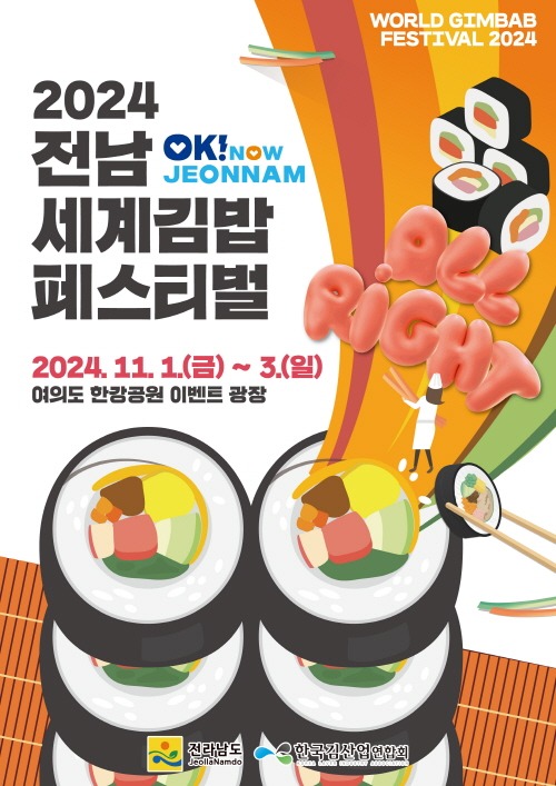 전라남도는 오는 11월 1일부터 3일까지 서울 여의도한강공원에서 내외국인이 참여하는 2024 전남 세계 김밥 페스티벌을 개최한다고 밝혔다.