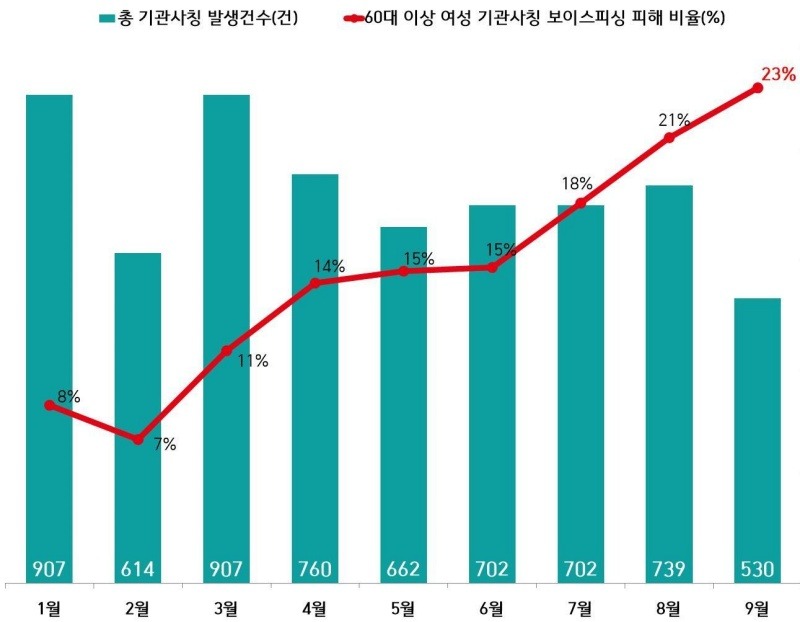 이 때문에 전체 기관사칭형 피해 건수 중에서 1억 원 이상의 다액 피해 건수도 전년도 같은 기간 대비 172% 증가한 763건이 발생했다.