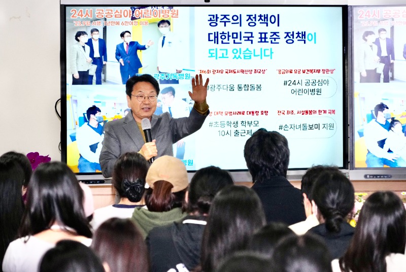 강 시장은 광주시와 조선간호대가 돌봄을 특성화 분야로 추진하고 있는 만큼 대한민국 표준정책으로 자리잡고 있는 ‘광주다움통합돌봄’ 시작 배경을 비롯해 소아과 오픈런 해소를 위해 시작한 ‘24시 공공심야어린이병원’ 등 학생들의 관심 분야에 대해 설명했다.