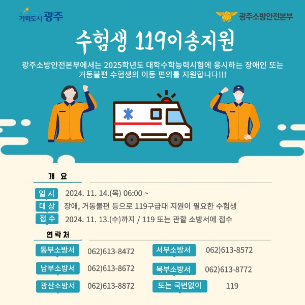 광주광역시소방안전본부는 오는 11월14일 시행하는 2025학년도 대학수학능력시험에 거동이 불편한 수험생의 편의를 위한 ‘119 이송 서비스’를 제공한다.