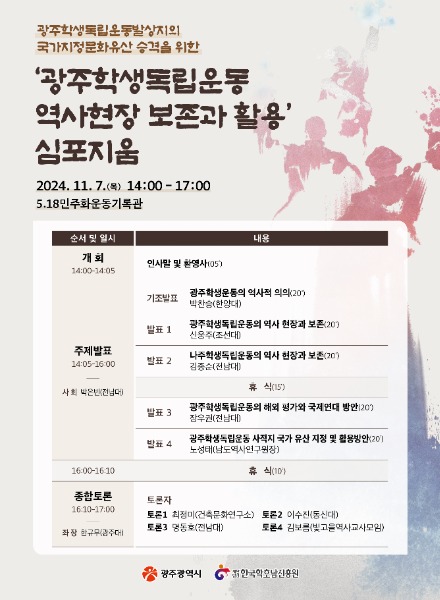 광주광역시(시장 강기정)와 (재)한국학호남진흥원은 7일 오후 2시 5·18민주화운동기록관에서 국가지정유산 추진을 위한 ‘광주학생독립운동의 문화유산적 가치 발굴을 위한 심포지엄’을 연다.