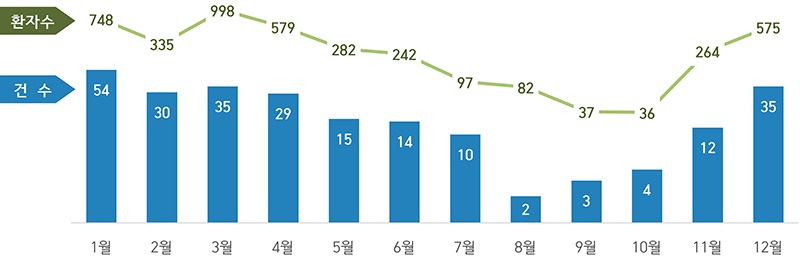 월별 발생 추이를 분석한 결과 12월부터 이듬해 2월까지 발생한 식중독 건수는 119건으로, 전체 식중독 건수의 49%가 겨울철에 발생한 것으로 나타났다.