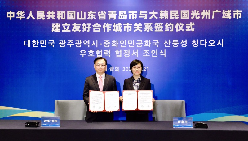 광주광역시(시장 강기정)와 중국 산둥성 칭다오시가 지난 21일 칭다오시청에서 ‘우호협력도시 협정’을 체결했다.