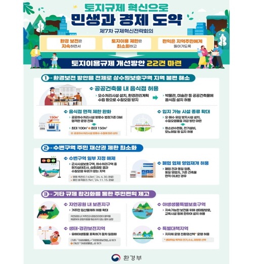 또한, 지정목적을 상실한 사유산지 등의 산지전용·일시사용 제한지역 35.8㎢를 해제하고, 267개 상수원보호구역 1120㎢ 안에 있는 공공 미술관·박물관 내 음식점을 오수처리시설 설치, 보호구역 외의 지역으로 방류, 환경관리계획 수립 등 조건으로 허용한다.