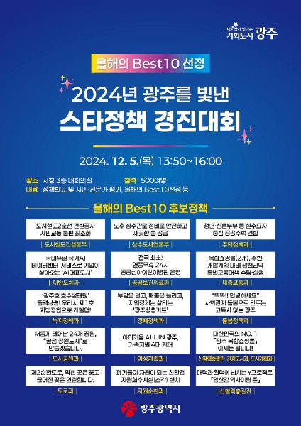 이병철 기획조정실장은 “2024년 광주를 빛낸 올해의 베스트10 정책은 무엇이 될지 시민의 냉정한 평가를 기다린다”며 “이 행사를 통해 시민의 의견을 반영한 정책 개발과 시행에 더욱 박차를 가할 계획이다”고 말했다.