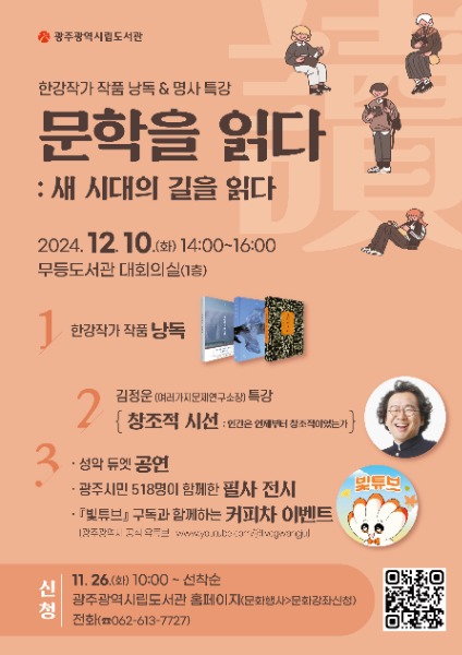 광주시립도서관은 노벨문학상 시상식 당일인 12월10일 오후 2시부터 무등도서관 대회의실에서 낭독회를 연다. 독서동아리 회원, 필사 참여자, 빛고을 책읽는 시민 등 총 5명이 낭독자로 참여해 한강 작가의 작품을 함께 느끼고 생각하는 시간을 갖는다.