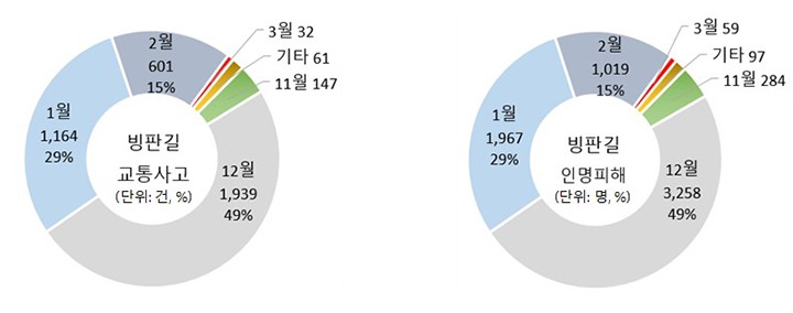 또한 교통사고 100건당 사망자 수인 빙판길 교통사고 치사율은 2.4로, 평소 교통사고 치사율인 1.4보다 1.7배 높았다.