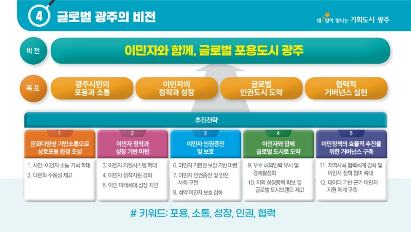 광주시는 기본계획에서 ‘이민자와 함께 글로벌 포용도시 광주’를 비전으로 5대 전략, 12개 추진과제, 10대 핵심과제를 마련했다.