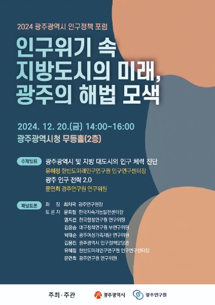 청년인구 유출과 저출생 가속화 등 인구 감소 위기 속에서 광주의 인구문제를 진단하고 해법을 모색하는 장이 마련된다.