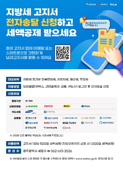 광주광역시(시장 강기정)는 납세자의 편의 증대와 탄소중립 실천을 위해 지방세 고지서 전자송달 신청을 받는다.