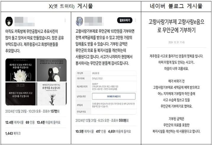 특히 사고 발생 이후, 회원규모가 큰 인터넷 대형 커뮤니티와 주요 SNS를 중심으로 “고향사랑기부를 통해 무안을 돕자”는 게시물이 잇따랐고, 이에 많은 국민들이 호응했다.