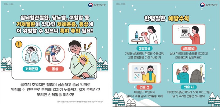 특히 이번 주부터 기온이 큰 폭으로 떨어져 강추위가 지속됨에 따라, 질병관리청은 ‘한랭질환’ 주의와 함께 야외활동 자제와 보온 유지 등 건강수칙 준수를 당부했다.