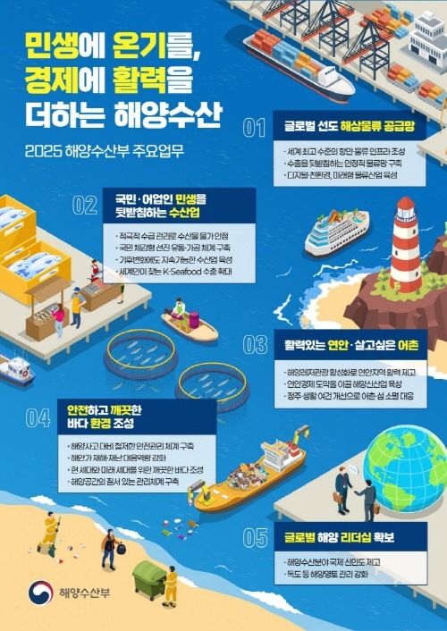 해양수산부는 '민생에 온기를, 경제에 활력을 더하는 해양수산'을 비전으로 '5대 분야, 16개 과제'를 중점적으로 추진하는 '2025년 업무 추진계획'을 발표했다.