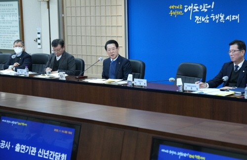 전라남도는 14일 도청 서재필실에서 전남개발공사, 전남연구원 등 19개 기관장이 참석한 가운데 ‘공사·출연기관 신년 간담회’를 열어 민생회복과 지역경제 활력 제고를 다짐했다.
