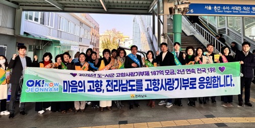 전라남도는 24일 목포역·순천역에서 민족 대명절인 설을 맞아 고향사랑기부제와 전남 사랑애(愛) 서포터즈 활성화를 위한 고향사랑 실천 캠페인을 진행했다.