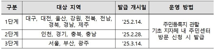 먼저 오는 14일부터 1단계로 대구, 대전, 울산, 강원, 전북, 전남, 경북, 경남, 제주 등에서 발급을 개시한다.
