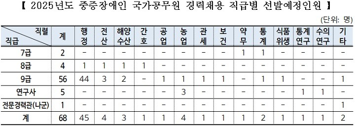 올해 중증장애인 국가공무원을 19개 중앙행정기관에서 행정, 전산, 농업 등 15개 분야에 걸쳐 다양한 직급으로 총 68명을 선발한다.