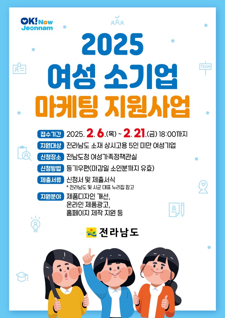 전라남도는 여성 소기업의 경쟁력 강화를 위해 ‘2025년 여성 소기업 마케팅 지원사업’을 추진한다.