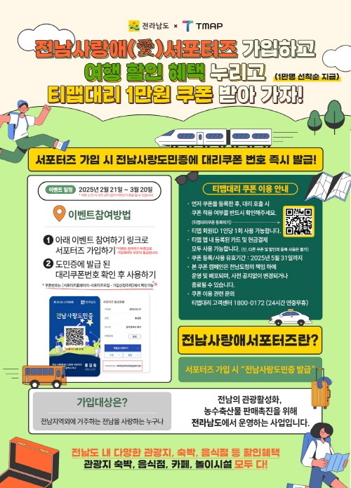 자세한 이벤트 참여 방법은 티맵(TMAP)앱과 전남 사랑애 100만 서포터즈 공식 홈페이지 공지사항에서 확인 가능하다.