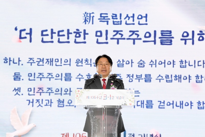 강 시장은 먼저 “당연한 것들을 거스르는 억지를 우리 눈으로 목도했고, 역사의 수레바퀴를 거꾸로 돌리려는 시도를 경험했기에 106주년 3·1절은 더욱 뜻깊다”며 “노력 없이 역사의 진보는 없고, 공동체의 평화도 없다는 사실을 우리는, 여실히 깨달았다”고 밝혔다.