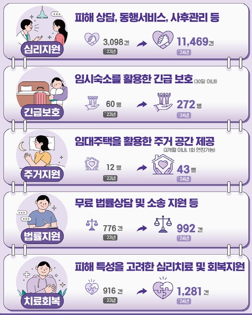 이에 피해자 보호를 위해 임시 주거지를 제공하는 긴급 주거지원은 2023년도 6개 시·도 시범사업 시행 후 지난해에 17개 시·도 전체로 확대해 총 272명이 보호를 받았다.
