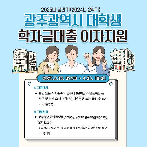 광주광역시(시장 강기정)는 지역 청년들에게 학자금대출로 인한 경제적 부담을 줄이고, 교육기회의 형평성을 높이고자 ‘2025년도 상반기 학자금대출 이자’를 지원한다.