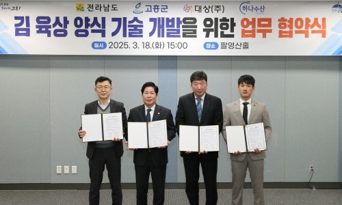 주요 협약 내용은 ▲김 육상양식 발전을 위한 기술 연구·개발 ▲김 육상양식 전문 교육·인력 양성 ▲김 육상양식 수요시장 창출을 위한 플랫폼 구축 등이다. 협약서에는 박영채 전남도 해양수산국장, 공영민 고흥군수, 김준규 대상(주) SEAWEED CIC 대표, 정한민 하나수산 대표가 서명했다.