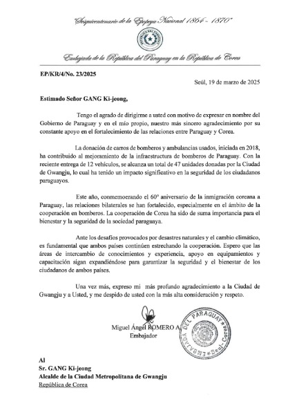 강기정 광주광역시장이 최근(3월19일) 미겔 앙헬 로메로 알바레스 주한 파라과이 대사로부터 광주시의 불용 소방차 무상양여와 소방 기반시설 강화 지원에 대한 감사서한을 받았다.
