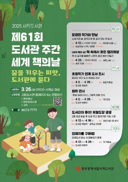 광주광역시립도서관은 ‘제3회 도서관의 날’(4월12일)과 ‘제61회 도서관주간’(4월12~18). ‘세계 책의 날’(4월23일)을 맞아 ‘꿈을 키우는 씨앗, 도서관에 묻다’를 주제로 다양한 독서문화 행사를 연다.