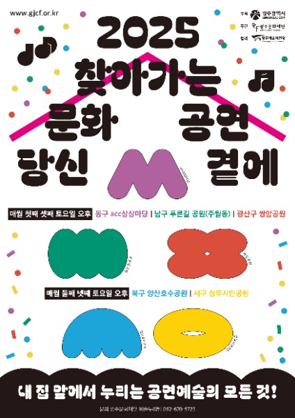 특히 이번 공연은 도시의 소음과 분주함에서 벗어나 평온함을 느낄 수 있고, 대중교통이나 자전거, 걸어서 찾아갈 수 있도록 5개 자치구 공원에서 공연을 펼쳐 광주시의 ‘대·자·보(대중교통·자전거·보행 중심) 도시’ 정책을 시민 일상에 안착시킨다.