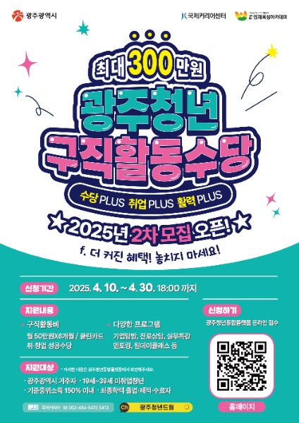 광주광역시(시장 강기정)는 ‘2025년 광주 청년구직활동수당 지원’ 2차 참여자 830명을 10일부터 30일까지 모집한다.