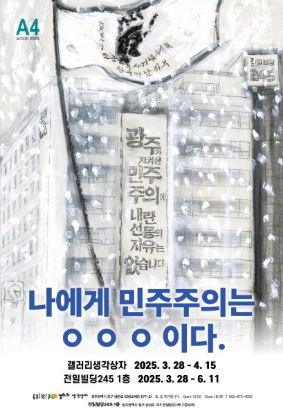 이 전시회는 A4액션추진위원회가 주최하고 갤러리생각상자가 후원하는 예술행동 프로젝트다. 계엄과 탄핵이라는 중대한 사회적 전환기를 지나며 시민‧예술가들이 느낀 분노, 우려, 희망을 예술적 언어로 표현한다. 특히 5·18민주화운동 45주년을 맞아 당시의 아픔을 직접 겪은 오월어머니집 회원들이 함께 전시에 참여해 깊은 울림을 전한다.
