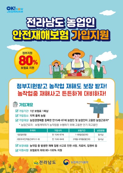 전라남도는 본격적인 영농철을 맞아 농업인의 안전한 농작업 환경 조성과 불의의 사고로부터 생계를 보호하기 위한 2025년 농업인안전재해보험에 가입할 것을 당부했다.
