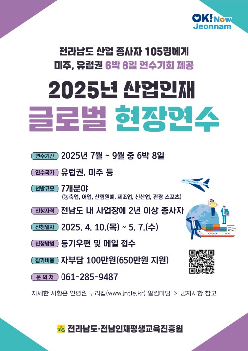 전라남도와 전남인재평생교육진흥원은 ‘인재육성 고속도로’의 일환으로 추진 중인 2025년 산업인재 글로벌 현장연수 참가자를 오는 7일까지 모집한다.